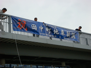 南海本線 泉大津駅前ターミナルの歩道橋に垂れ幕を設置しました。ターミナルへ入る真っ正面の場所なのでとてもよく目立ちます。取付けは田中町のだんじりの実行委員の方がなさいました。何ヶ月かごとに取付ける位置を変えていくそうです。